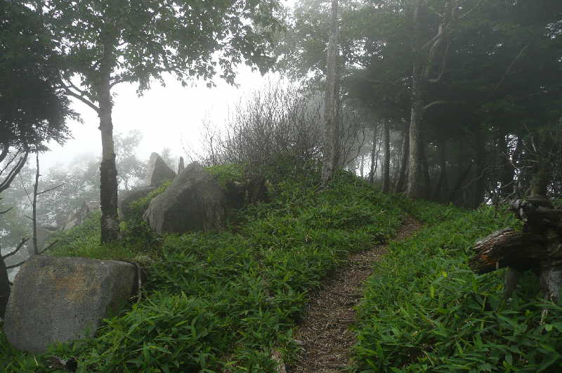 この先ちょっと行くと足尾方面の展望が開けるが、このガスではなにも見えない。行くまでもない。ガスの中に長居はしたくないので、まだそんなにお腹も空いていないので、お昼は先延ばし。まず右足にバンデリンを塗り込み、そしてTシャツと下着を絞ってみる。さすがにTシャツからは滴も落ちなかったが、下着からは数滴したたり落ちた。食事の代わりにチョコレートを2かけ食べ、水を飲んで、下山にかかる。水はペットボトル3本用意してきたが、ここで2本空になった。あと1本だが、曇ってきたし、あとは下りなので、間に合うだろう。相変わらず山頂はガスの中