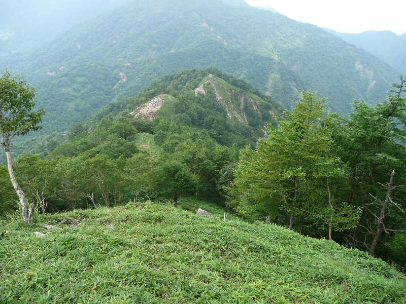 下り。痛みはある。しかし、酷くはない。更に痛くなるのが心配でスイスイとは歩けないが、少し慎重に歩いている分には全く問題ない。景色もろくに見えないし、ひたすら下る。雨量計から3つめの偽ピークから雨量計方面を見下ろす