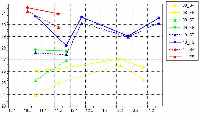縦軸の目盛りは、PCSの得点。FSはSPに合わせて1/2にしてある。
