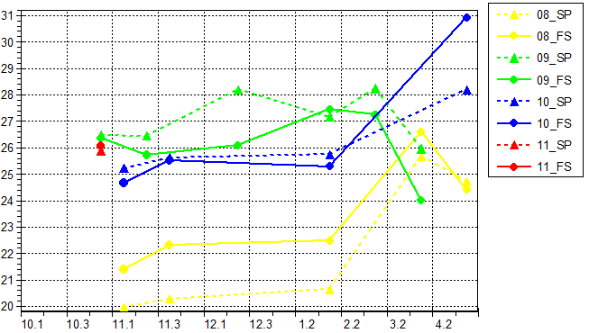 09WC(世界選手権)で大幅アップし世界の一線級の仲間入り。09-10季はその水準を確保したものの10WCでは下降。10-11季は09-10を少し下回るスコアで推移したが地元のWCでの神演技で初の30越え。11-12季はほぼ09-10季並みの26前後でスタート。今季はここから伸ばせるのか。