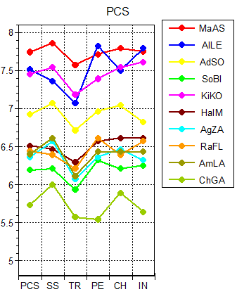 真央ちゃん、SSとTSはダントツ。PE、INでは、僅差ながらアリョーナが真央ちゃんの上にでた。CHは真央ちゃんが上なんだけど。キーラは、ほぼ真央ちゃんと同じ波形でちょっとずつ下回った。アデリーナはTSとINがちょっと低めだが、SPのPCS全体としては、フランス大会のエリザベータをかなり上回った。遥ちゃんは、PE、CH、INの3つが高く評価され、レイチェルとCH以外ではほぼ同じもCHで上回り全体でもレイチェルを上回った。