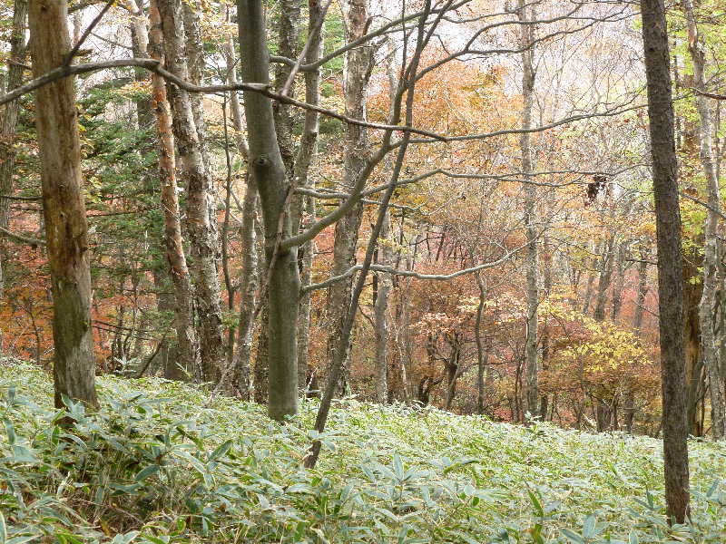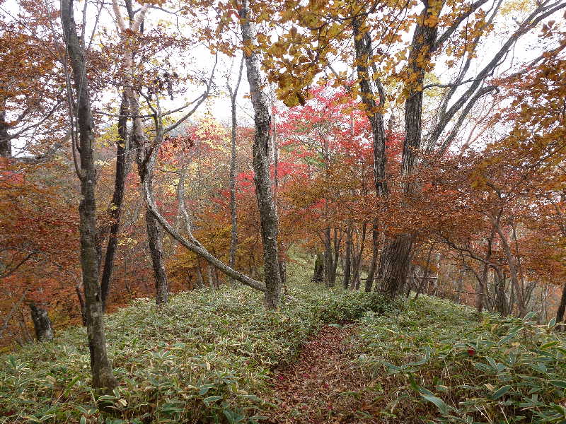 ようやく平坦になったけれど、でも笹原、というよりは尾根道。しかし、紅葉はきれい。12:12